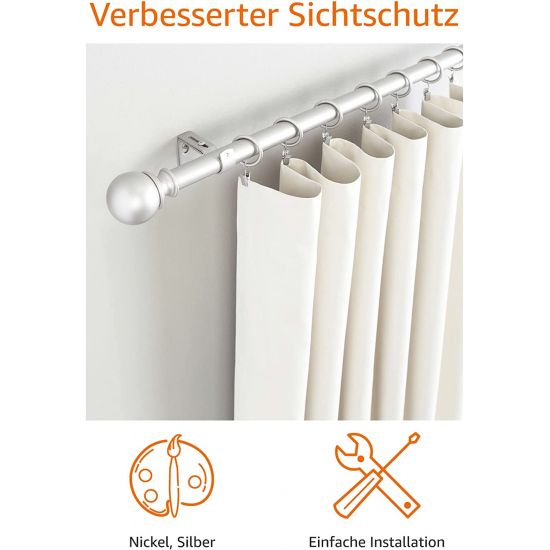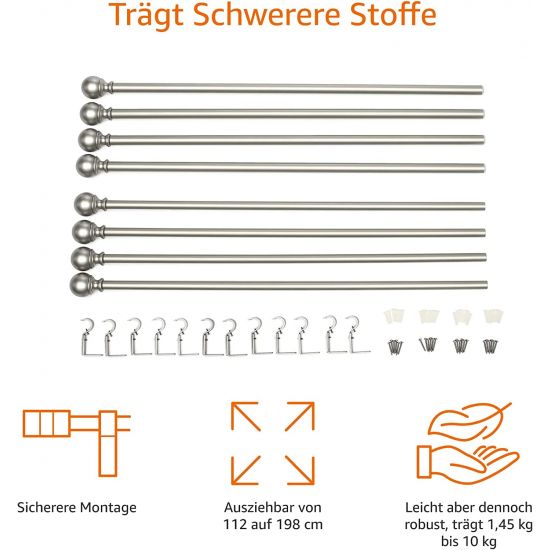 Längenverstellbar Die Gardinenstange von AmazonBasics eignet sich dank ihres Teleskop-Designs für eine Reihe von Fensterbreiten. Die längenverstellbare Stange kann auf die erforderliche Länge angepasst werden. Wenn die Gardinenstange auf eine größere Breite als das Fenster selbst eingestellt wird, können Vorhänge eine bessere Abdeckung bieten und somit für mehr Privatsphäre sorgen und verhindern, dass Licht seitlich durch die Gardinen ins Zimmer scheinen kann.